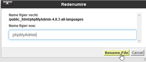 - atsiras į katalogą su atitinkamo archyvo pavadinimu, bet be .zip plėtinio, pasirodys public_html kataloge. Šis katalogas turi būti pervadintas taip, kad liktų tik "phpMyAdmin". Pervadinimas atliekamas pasirenkant atitinkamą katalogą ir paspaudžiant "Pervadinti" mygtuką viršuje puslapio juostoje.