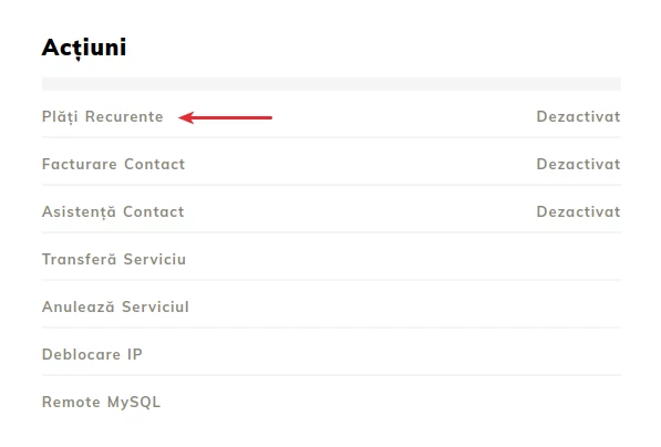 - Aiškumo Paslaugos rodo aktyvias prieglobos paketų. Paspauskite ant paslaugos, kurioje norite aktyvuoti mokėjimo mokėjimą, ir bus atidaryta paslaugos valdymo puslapis. Valdymo lange, Veiksmai skiltyje, yra galimybė aktyvuoti pasikartojantį mokėjimą.