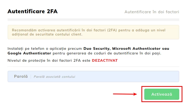 - Kitame žingsnyje reikia įvesti kliento paskyros slaptažodį ir aktyvuoti parinktį paspaudžiant žaliąjį mygtuką Aktyvuoti;