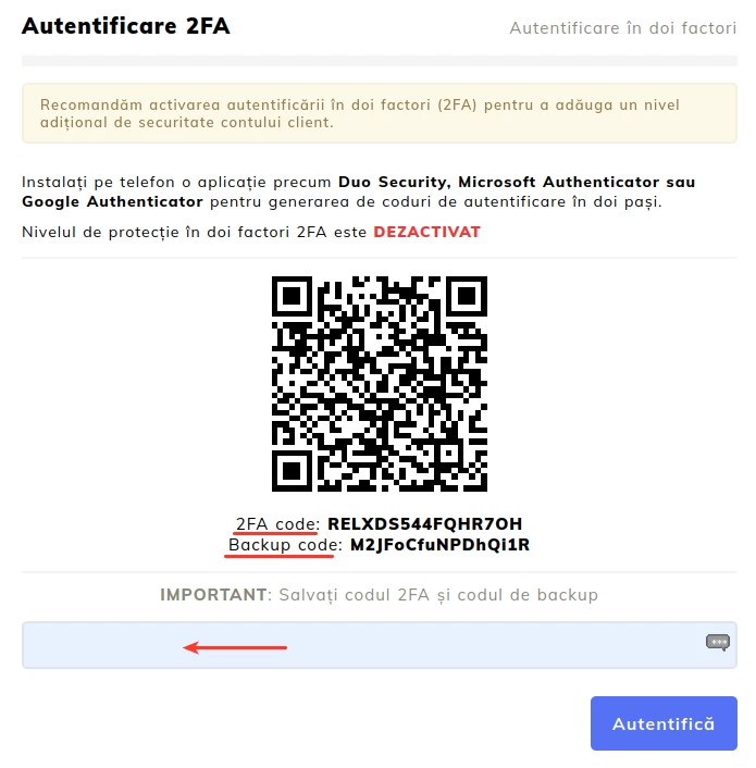 Po sukonfigūravus programą, norint užbaigti 2FA aktyvavimą, jums reikės pirmą 6 skaitmenų kodą, kurį sugeneruoja programa, įvesti į laukelį, skirtą raudonos rodyklės nurodytam žemiau pateiktoje nuotraukoje.