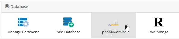 - Prisijungę prie Webuzo administravimo skydelio, ieškokite „Duomenų bazė“ skyriaus rodoma langelyje ir iš ten pasirinkite „phpMyAdmin“