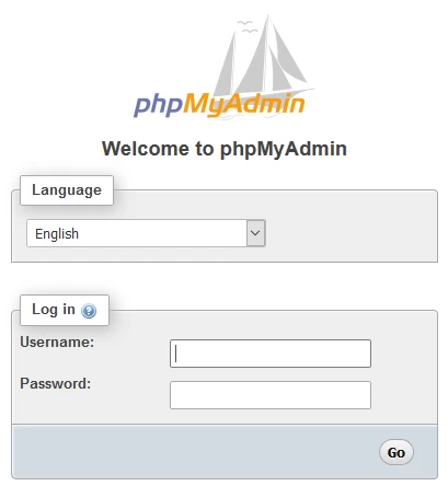 - Atidarius puslapį, pasirodys langas, kuriame bus įvedami vartotojo ir duomenų bazės slaptažodžio, kurią norima pasiekti, duomenys, po to paspaudžiamas mygtukas "Eiti".
