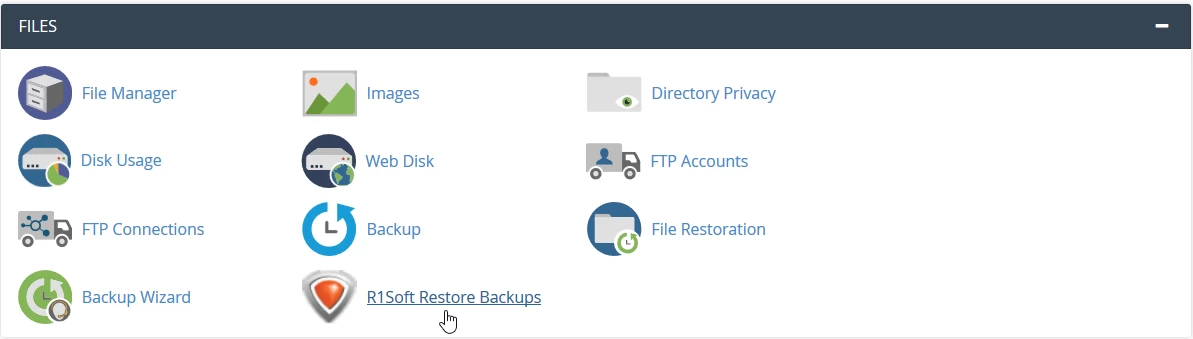 - Kai pasieksime valdymo pultą, pereisime prie Bylų skyriaus ir paspausime R1soft Atkurti atsargines kopijas.