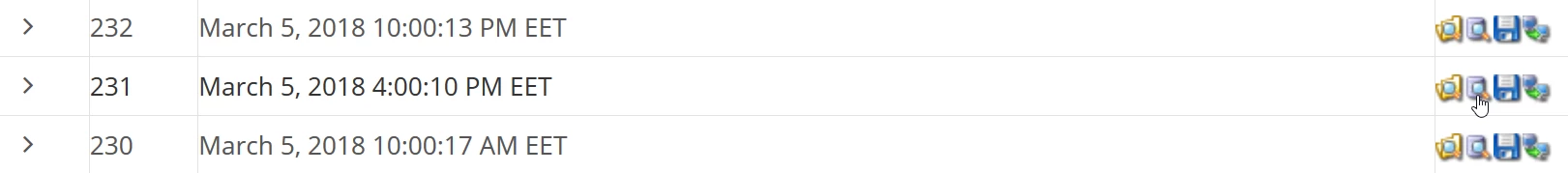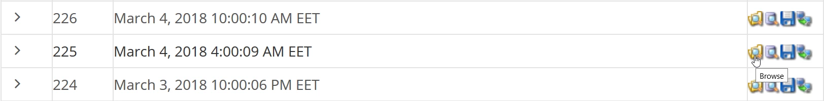 - Norint peržiūrėti išsaugotas duomenų bazes iš pasirinkto laikotarpio, spustelėkite rodyklę ">".