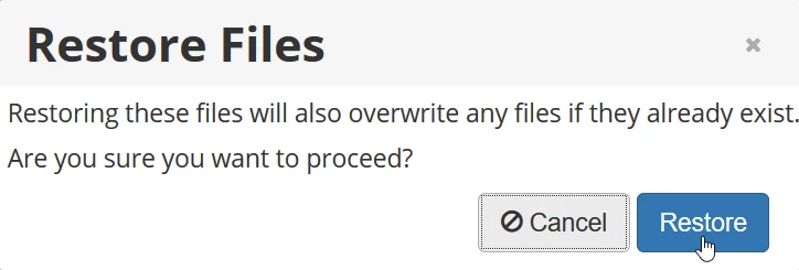 - Musime gauti įspėjimą, kuris informuos mus, kad esami failai pasirinktoje aplankale bus pakeisti atsarginių kopijų failais. Jei norime išsaugoti dabartinių failų kopiją, galime pervadinti aplanką naudojant File Manager arba FTP klientą, kad nenurodyti aplanko turinio su atsarginėmis kopijomis (pavyzdžiui, pervadiname public_html į public_html_senas ).