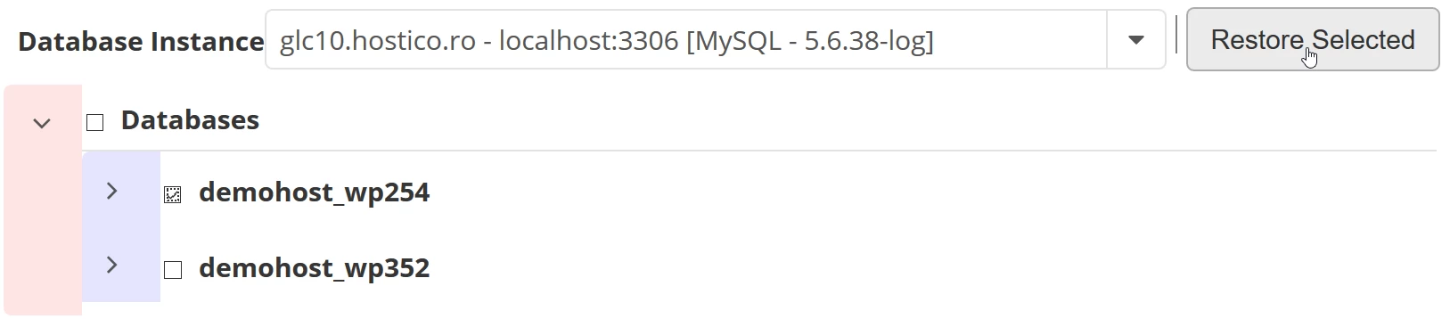 - Toliau bus rodomos esamų duomenų bazių sąrašas atkūrimo punkte. Pažymėsime kairėje duomenų bazės langelį, kurią norime atkurti, ir spustelėsime Atkurti pasirinktas dešinėje viršuje puslapio. Atkūrimas pakeis esamą duomenų bazę. Jei nenorime prarasti informacijos, galime atsisiųsti dabartinę jos kopiją naudodamiesi PhpMyAdmin.