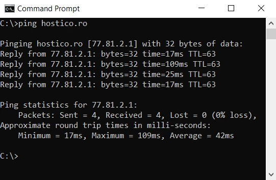 Mūsų pavyzdyje matome, kad IP, susijęs su domenu hostico.ro, yra 77.81.2.1.